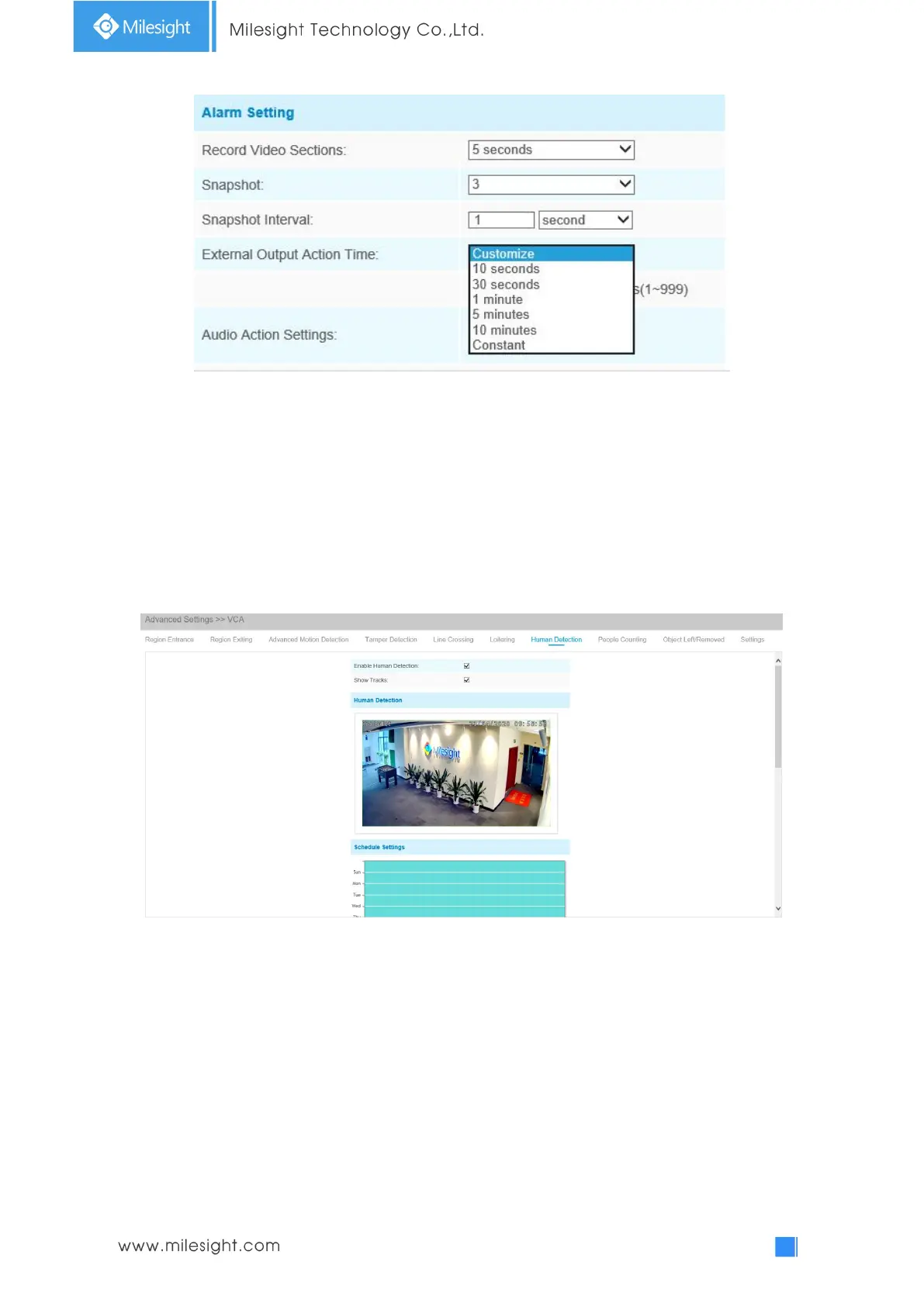 Action Time, when detected object is marked as “person”, External Output Action alarm time will