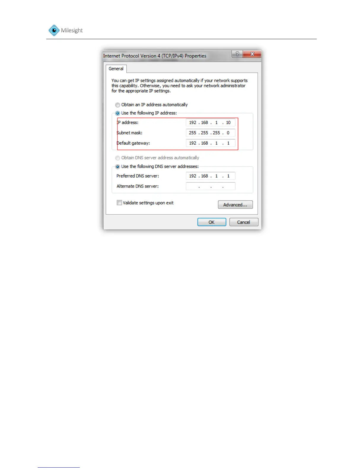 popup window, enter an IP address with a same segment with Milesight network camera (e.g.: