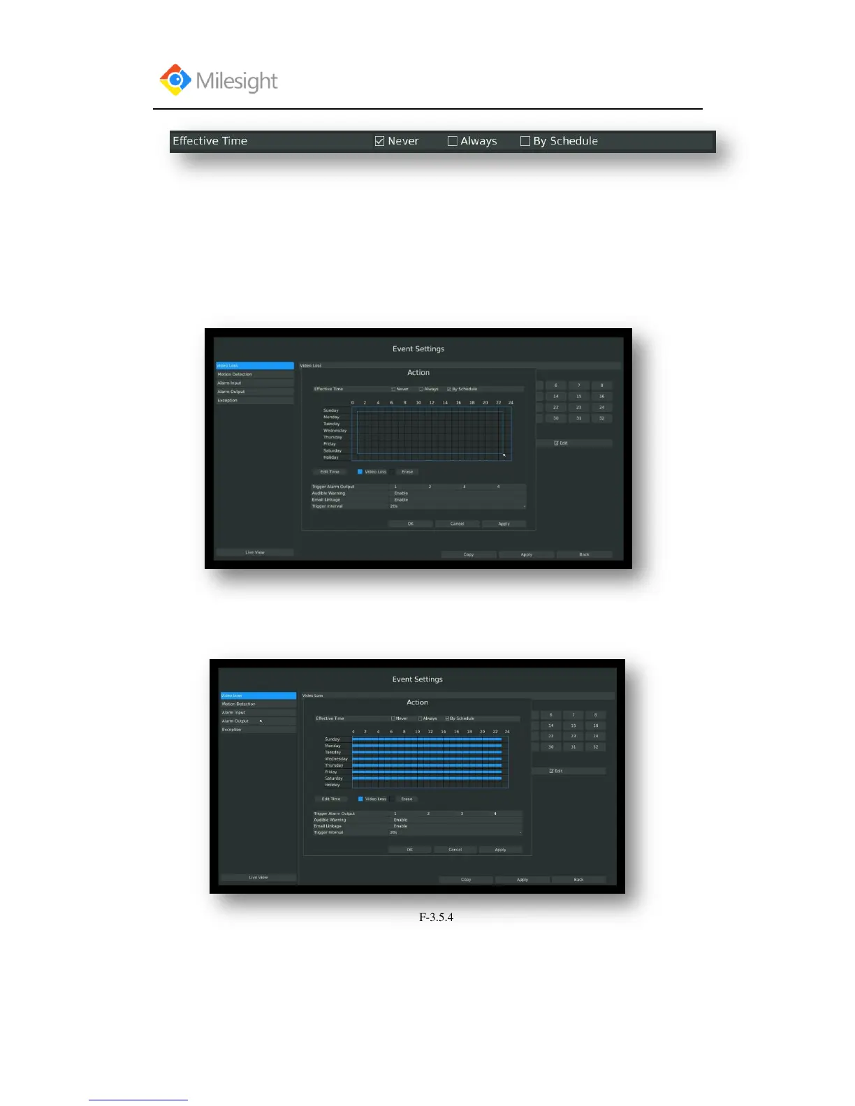 [Never]: Your NVR will not trigger any actions when [Never] button is checked. No matter the