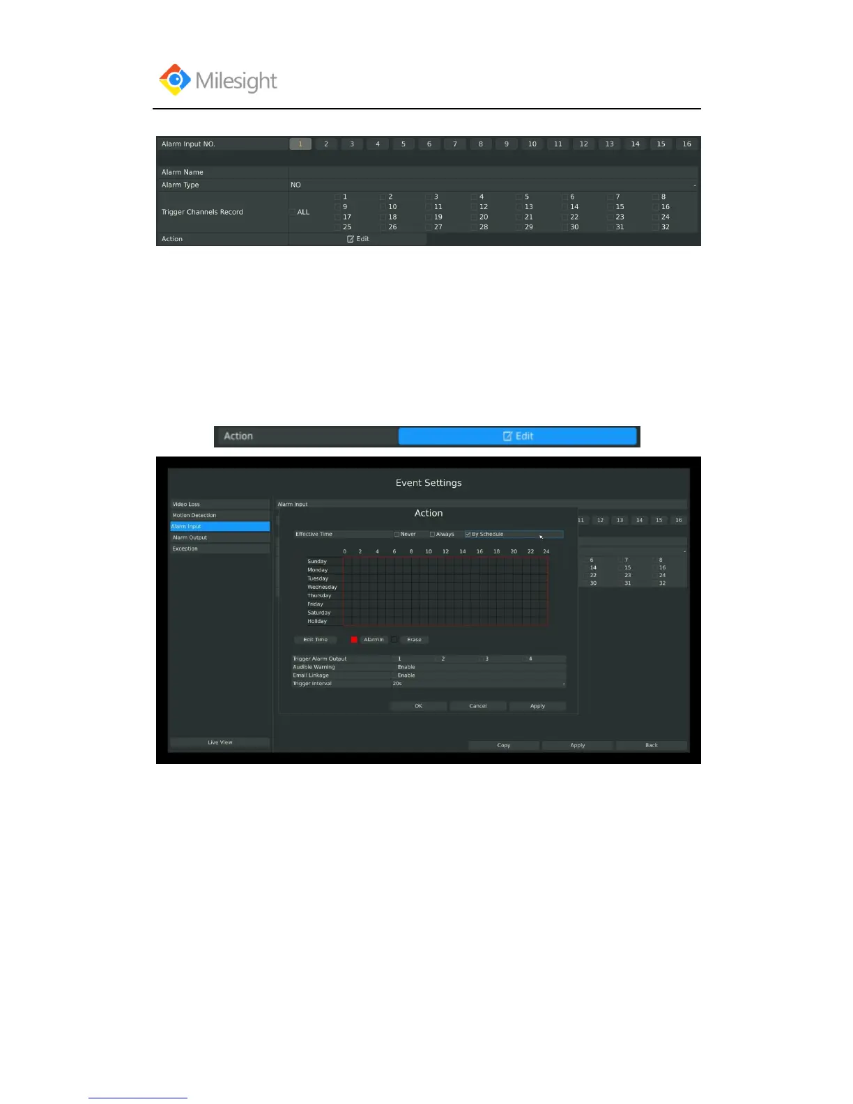 [Trigger Channels Record]: Once the channel in the [Alarm Input No] has alarm input, which