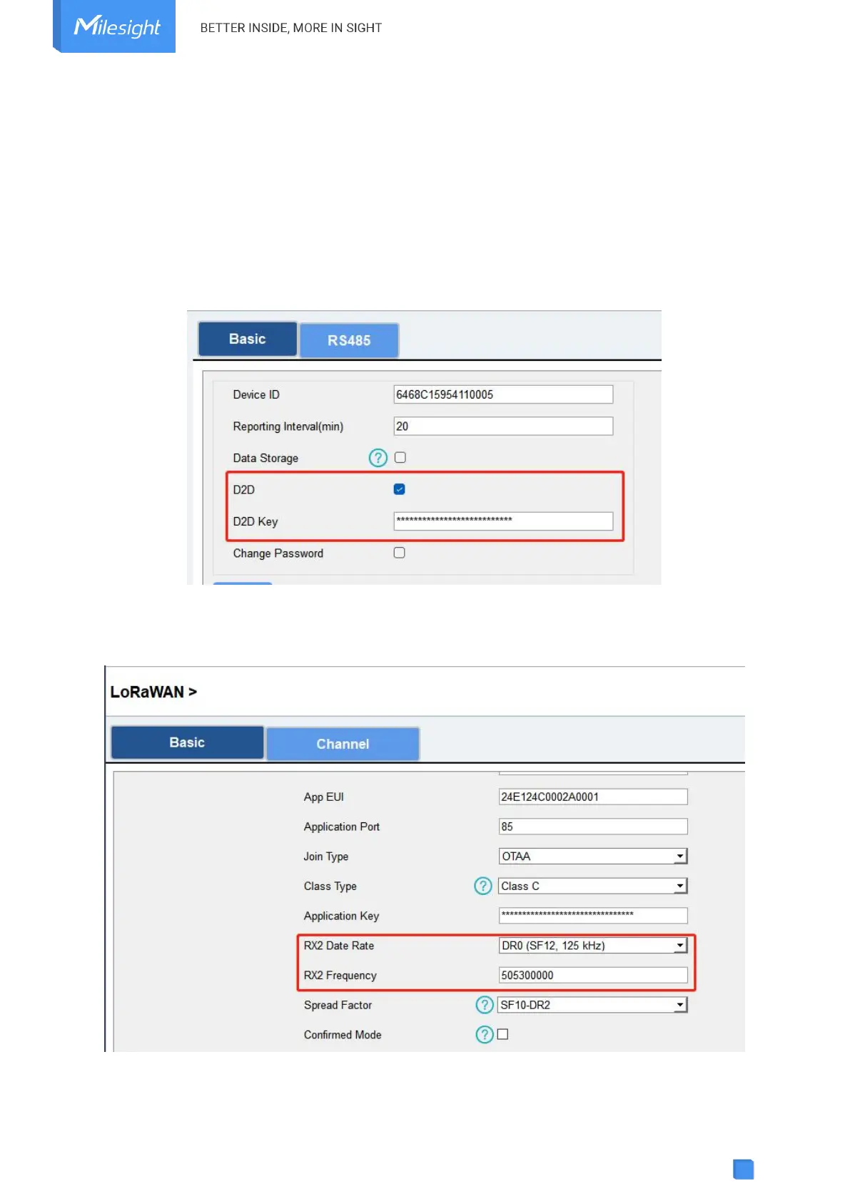 2. Go to LoRaWAN Settings > Basic to configure the RX2 datarate and RX2 frequency. When