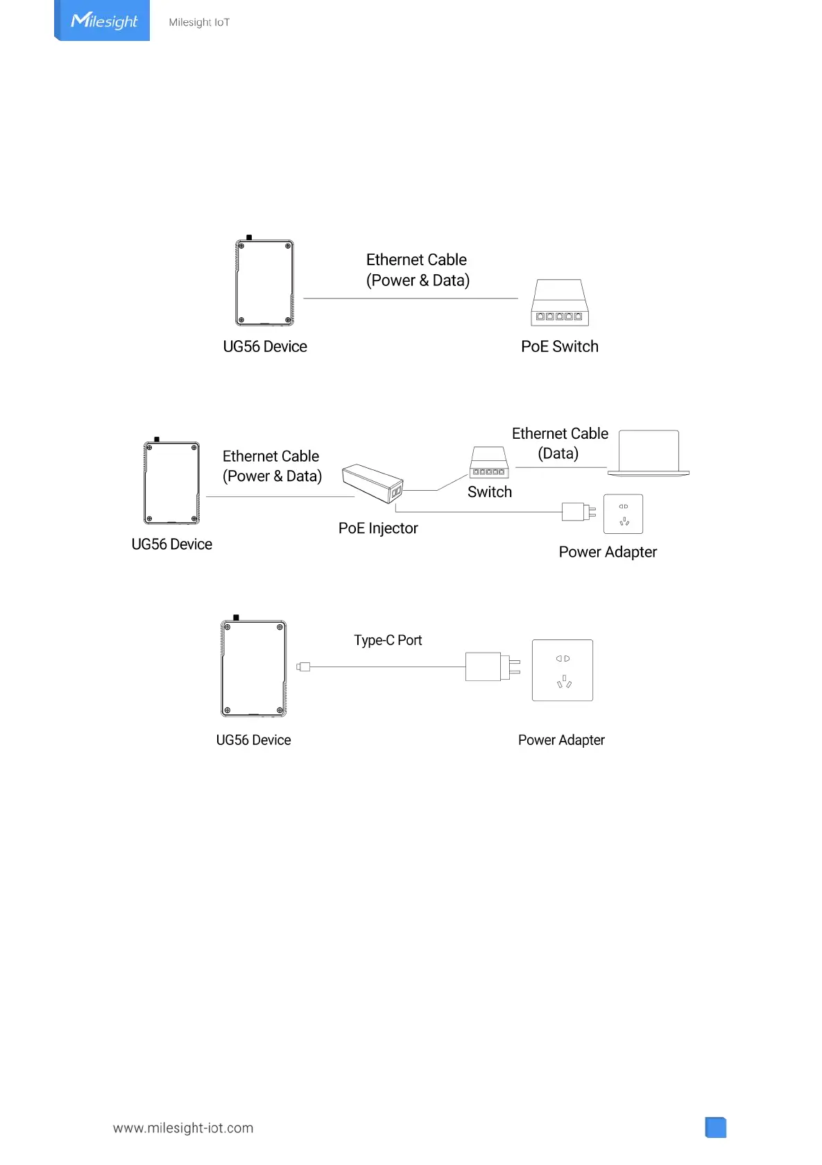 UG56 can be powered by 802.3af standard PoE or Type-C port (5 VDC). If both are connected, the device