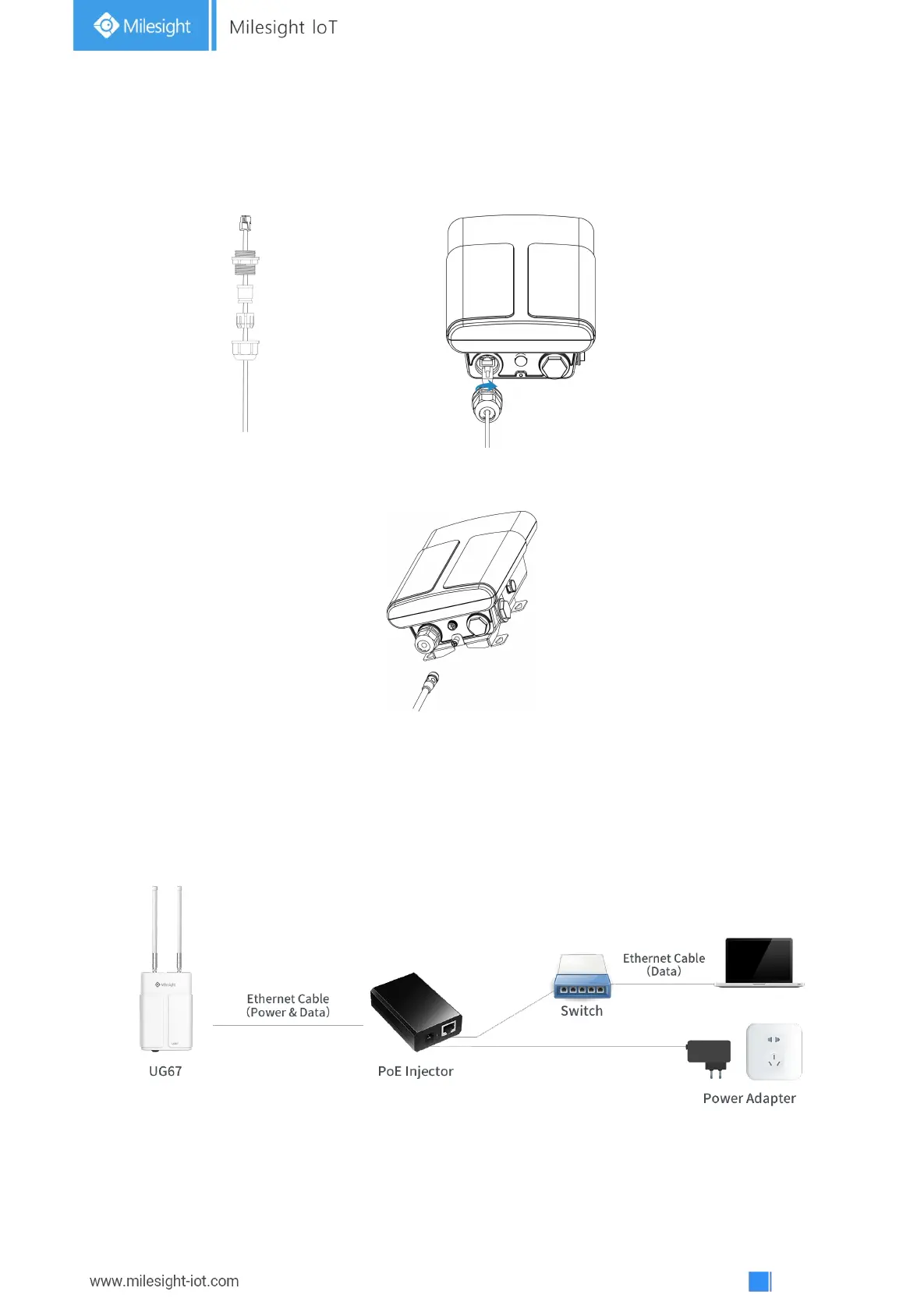 UG67 can be powered by 802.3af standard PoE injector or other PoE devices. Please follow the picture