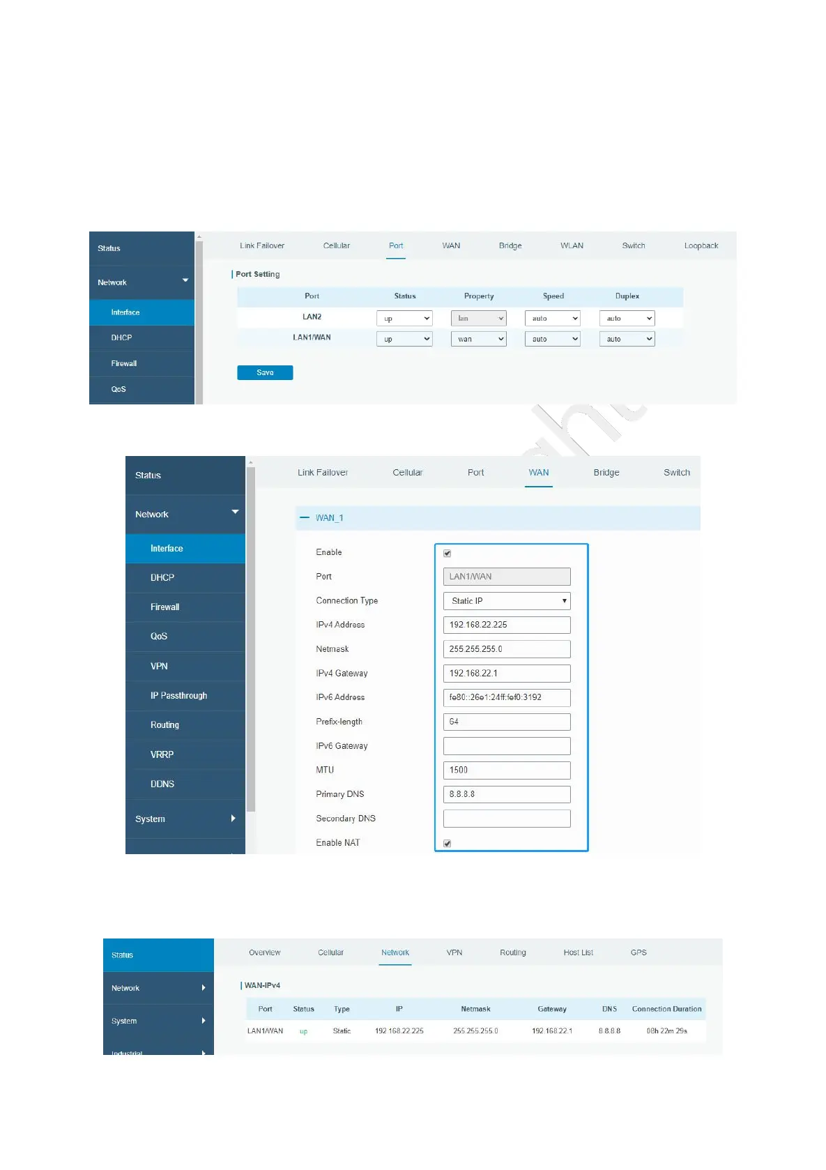 B. Go to “Network > Interface > WAN” to configure WAN parameters. Take static IP configuration as an