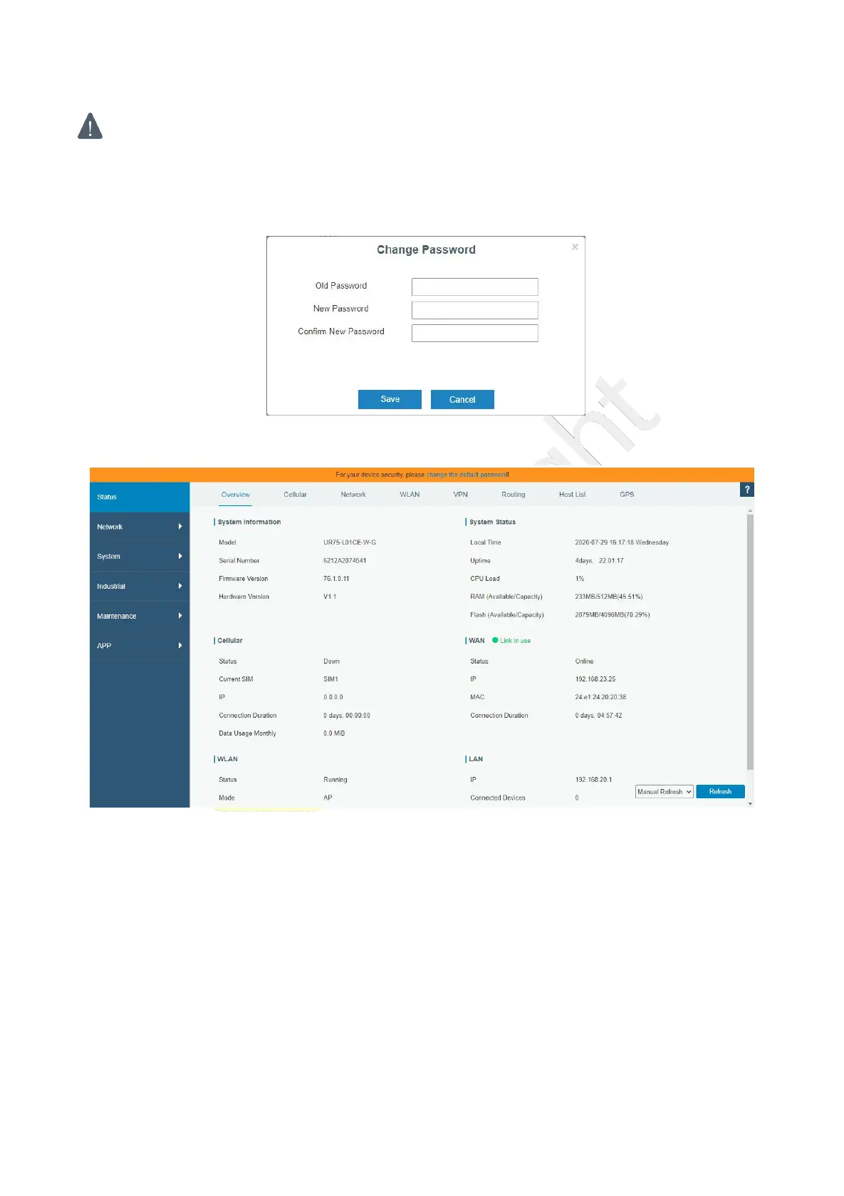 Milesight UR75 - Web GUI Login and Password Change; Password Change Prompt; Web GUI Overview