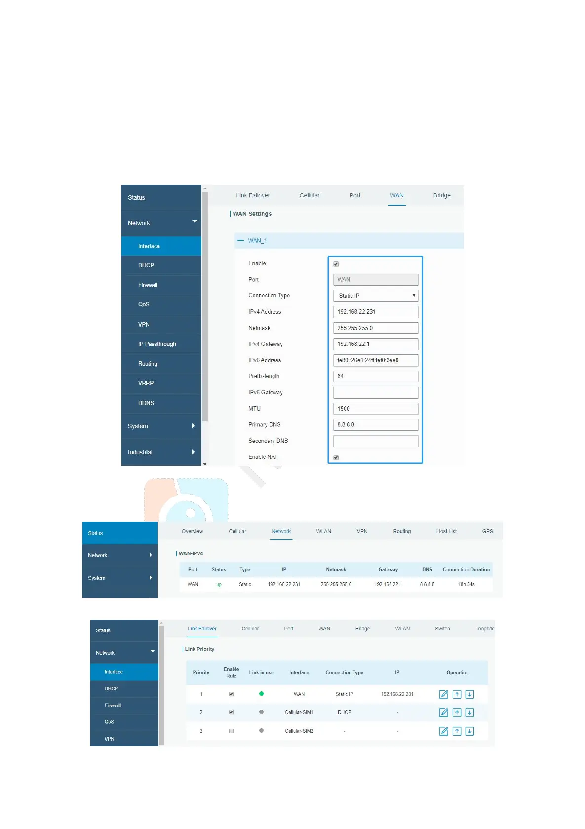 A. Go to “Network > Interface > WAN” to configure WAN parameters. Take static IP configuration as an