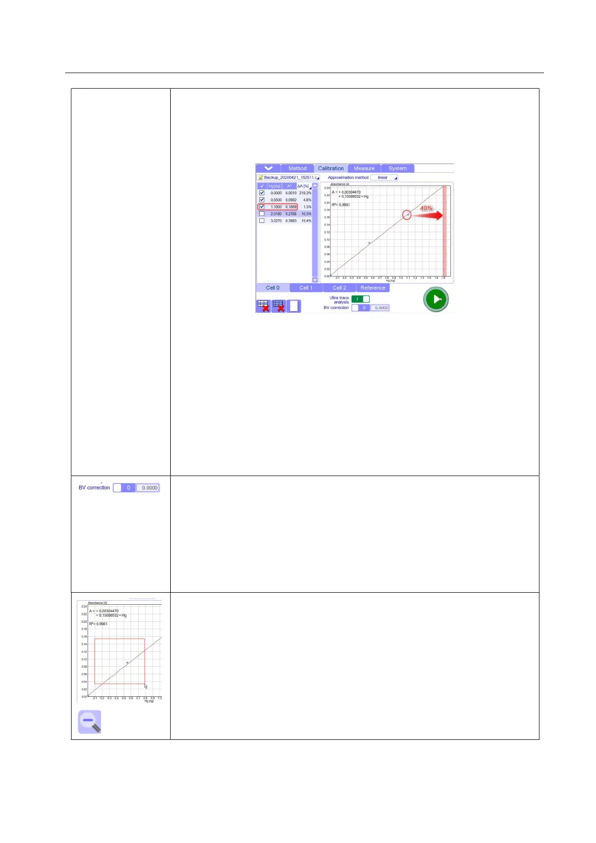 Zoom: a specific area of the calibration graph can be zoomed by pressing with