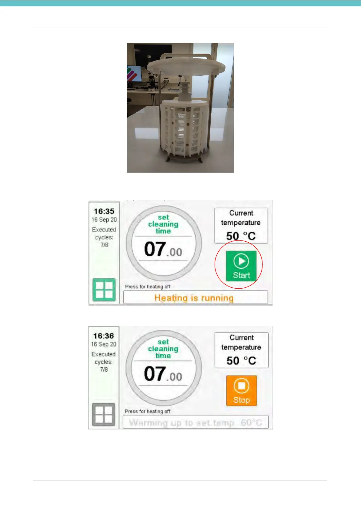 When “Start” is pressed the instrument reach the cleaning temperature and the cleaning cycle starts