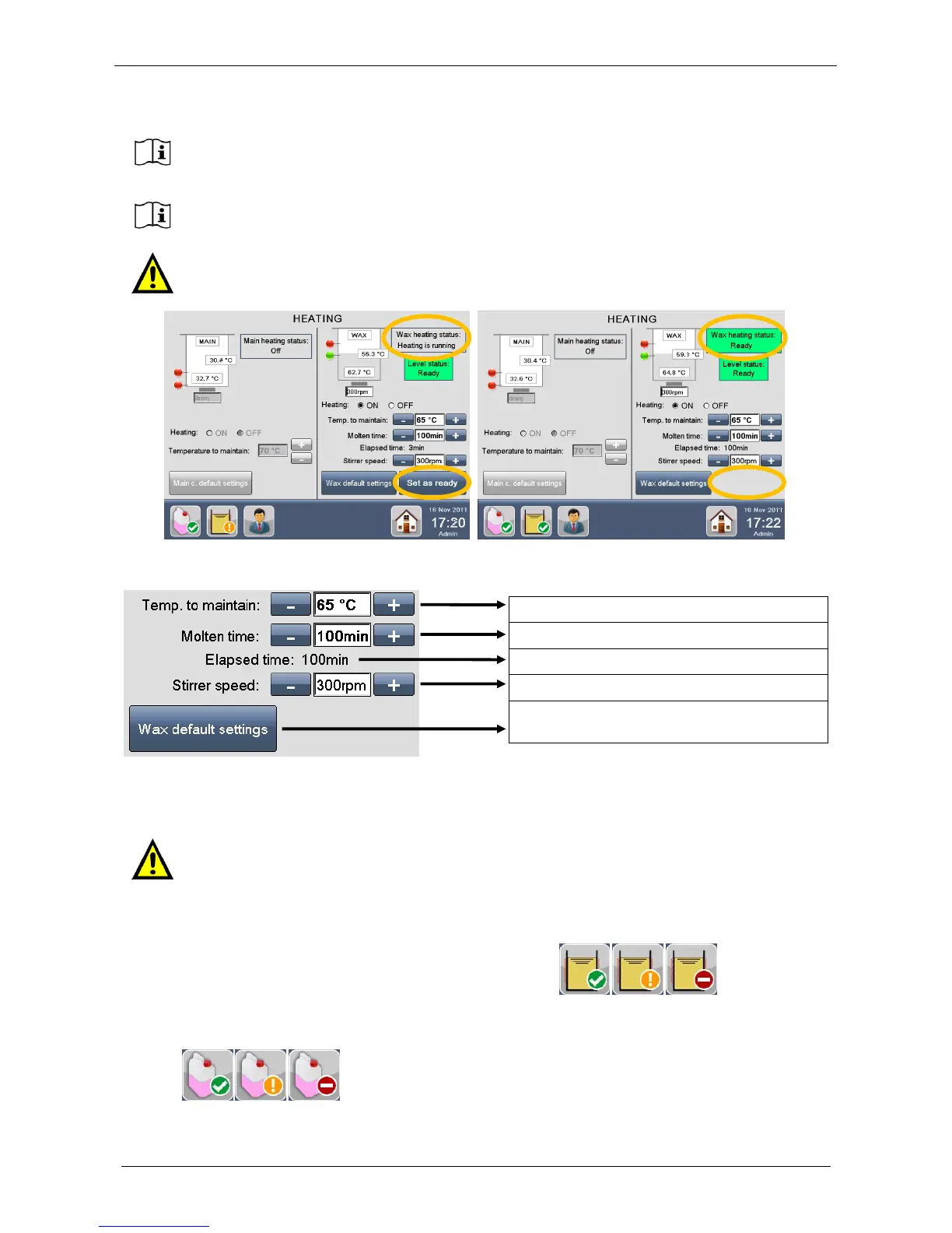Settings) when the WAX heating status icon becomes YELLOW and the “Set as ready”