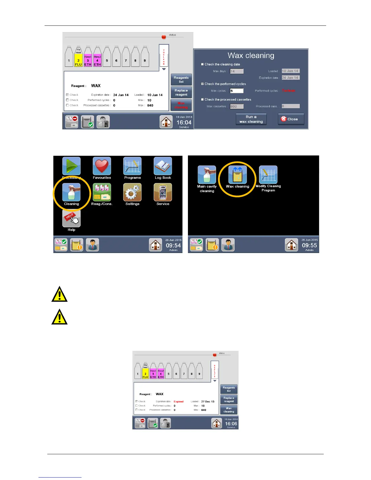 screen under the WAX cleaning icon (number of cassettes processed, performed cycles and loading date)