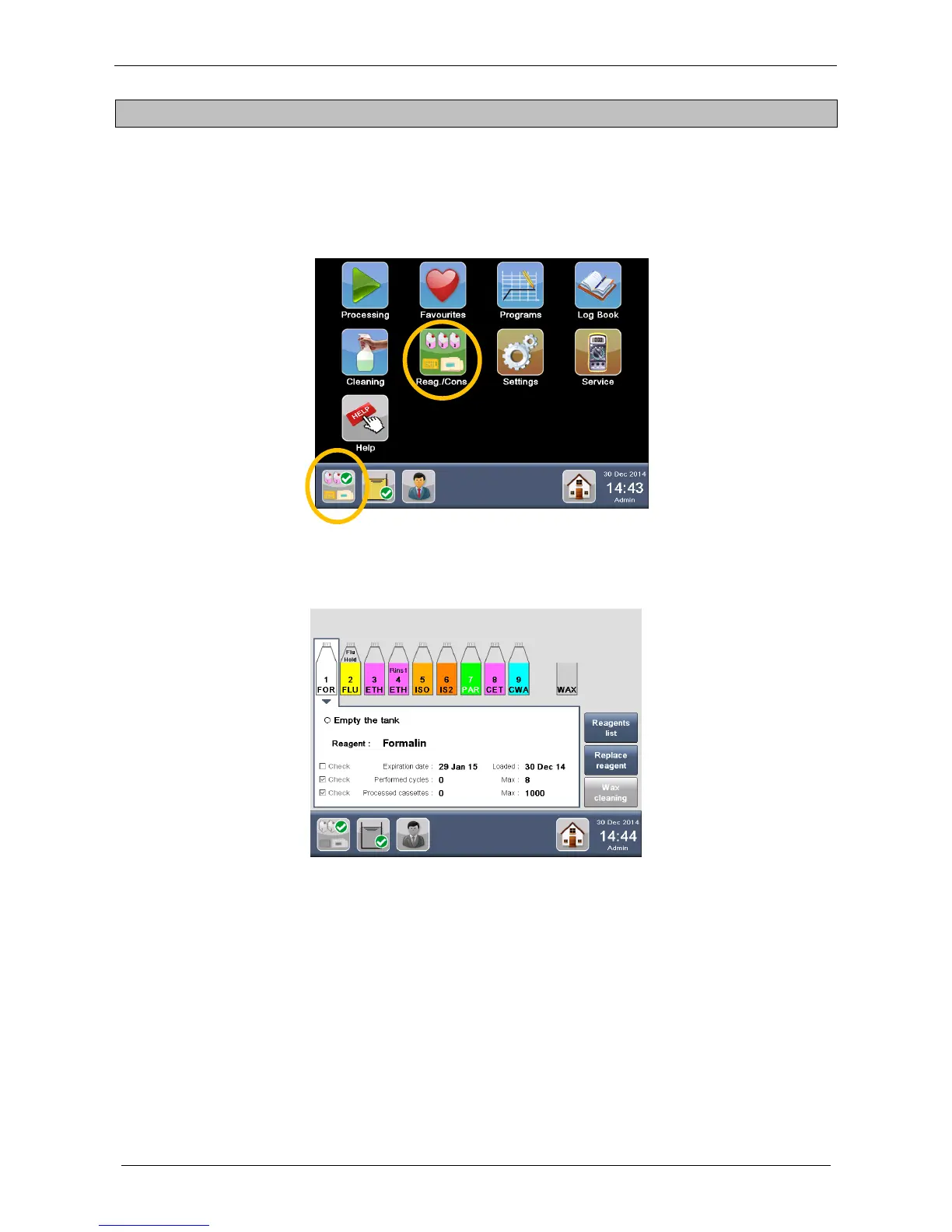 loaded in the unit (Wax included). It is possible to check the reagents STATUS by selecting the relative