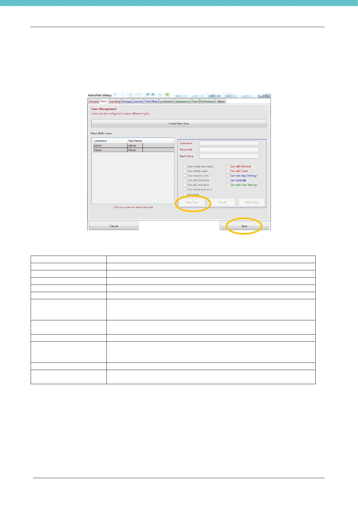 Click Users to create, modify or eliminate a user and/or change user rights.