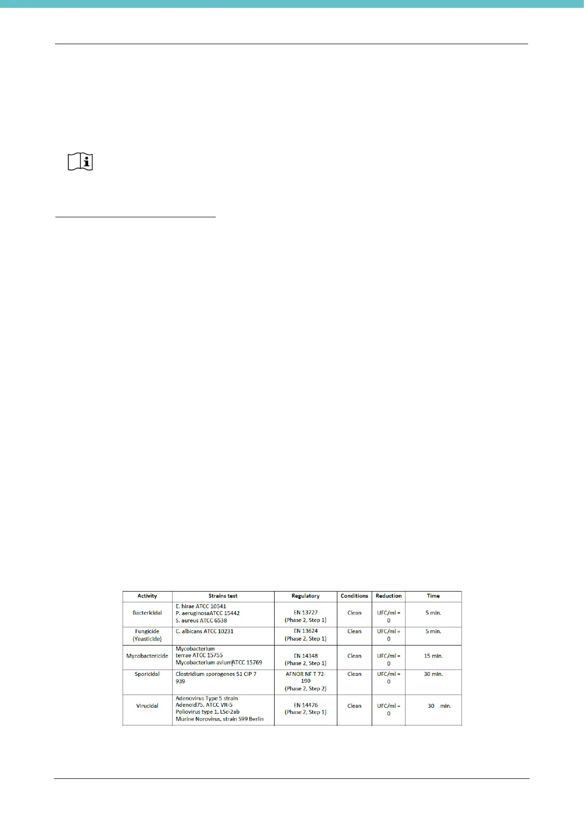 bactericidal (> 6 log10 of reduction in 5 minutes) and virucidal (> 5 log10 of reduction in 5 minutes). Synergic