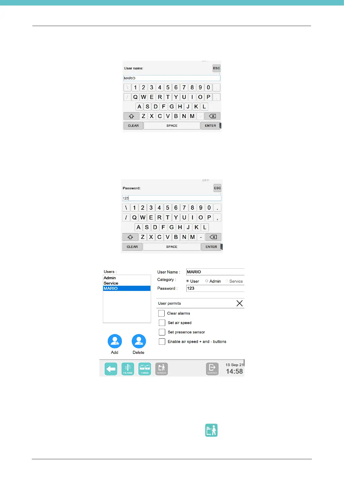 Click on “Add”, a keyboard appears. Enter the new user name and press “Enter”.