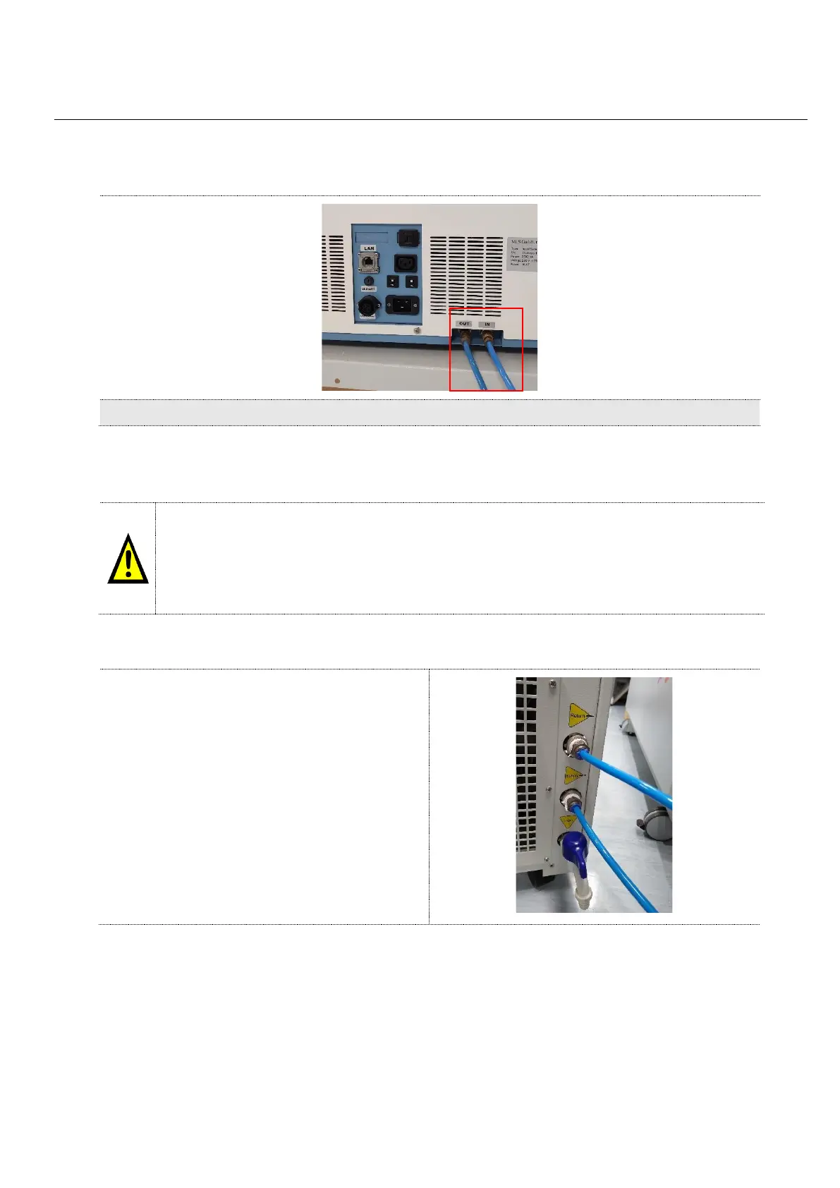 The hoses for cooling water inlet and outlet of the water chiller are connected to the back panel of the