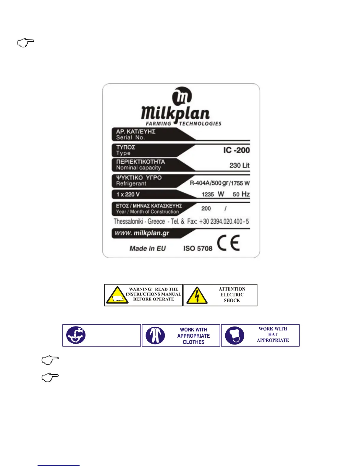 phone number, fax) and information for the proper installation of the machine (the model, serial number, year of manufacture,