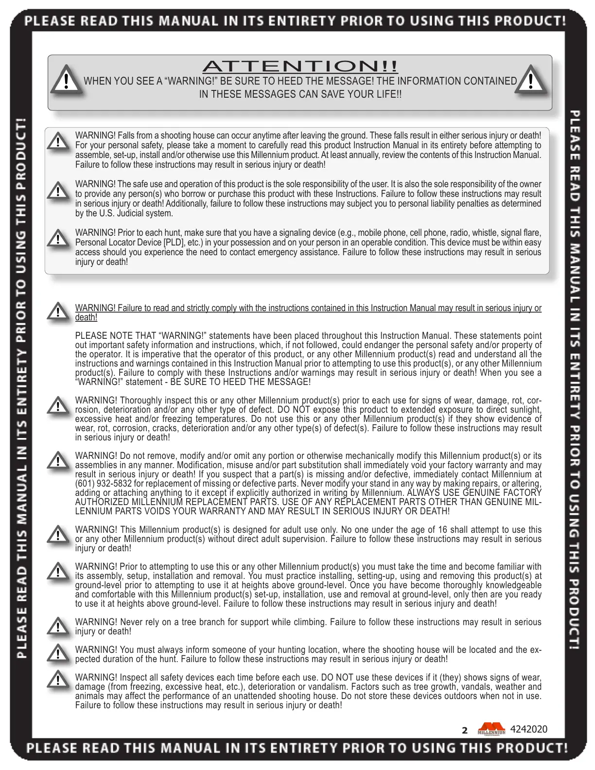 assemble, set-up, install and/or otherwise use this Millennium product. At least annually, review the contents of this Instruction Manual.