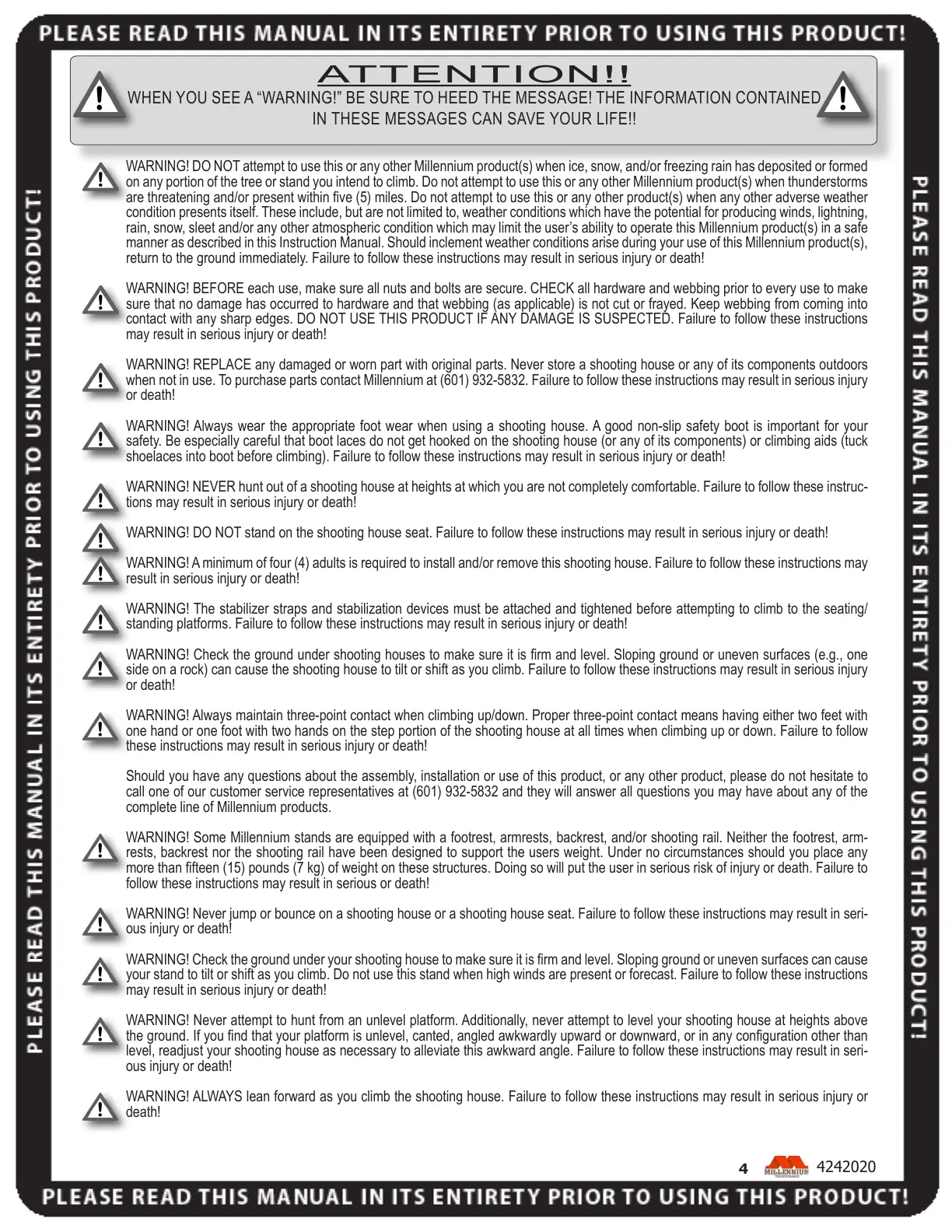 WARNING! Some Millennium stands are equipped with a footrest, armrests, backrest, and/or shooting rail. Neither the footrest, arm-
