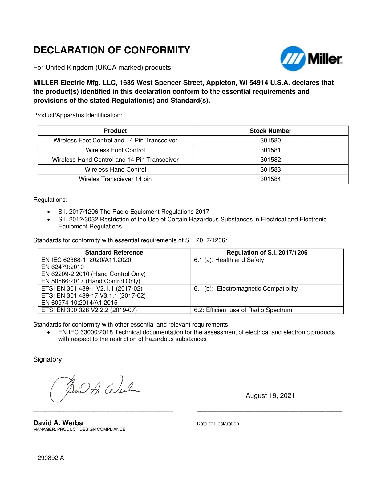 MILLER Electric Mfg. LLC, 1635 West Spencer Street, Appleton, WI 54914 U.S.A. declares that