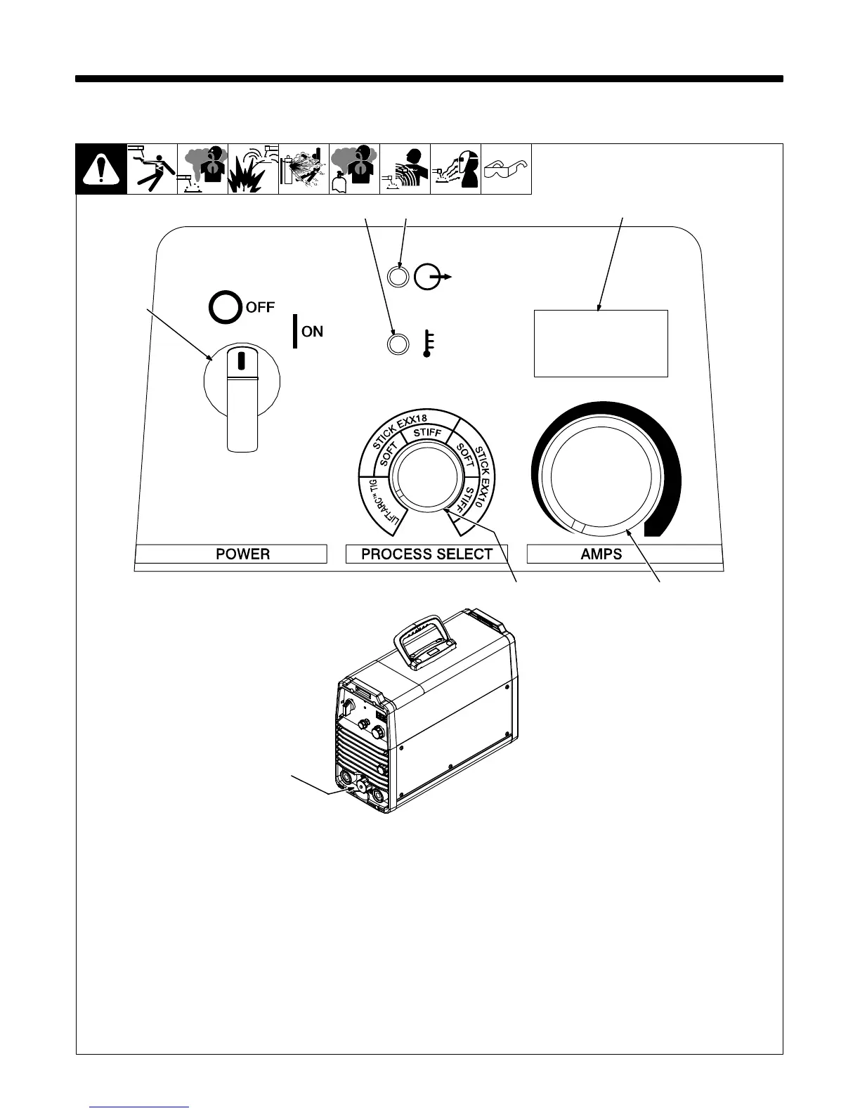 The display shows amperage setting in both
