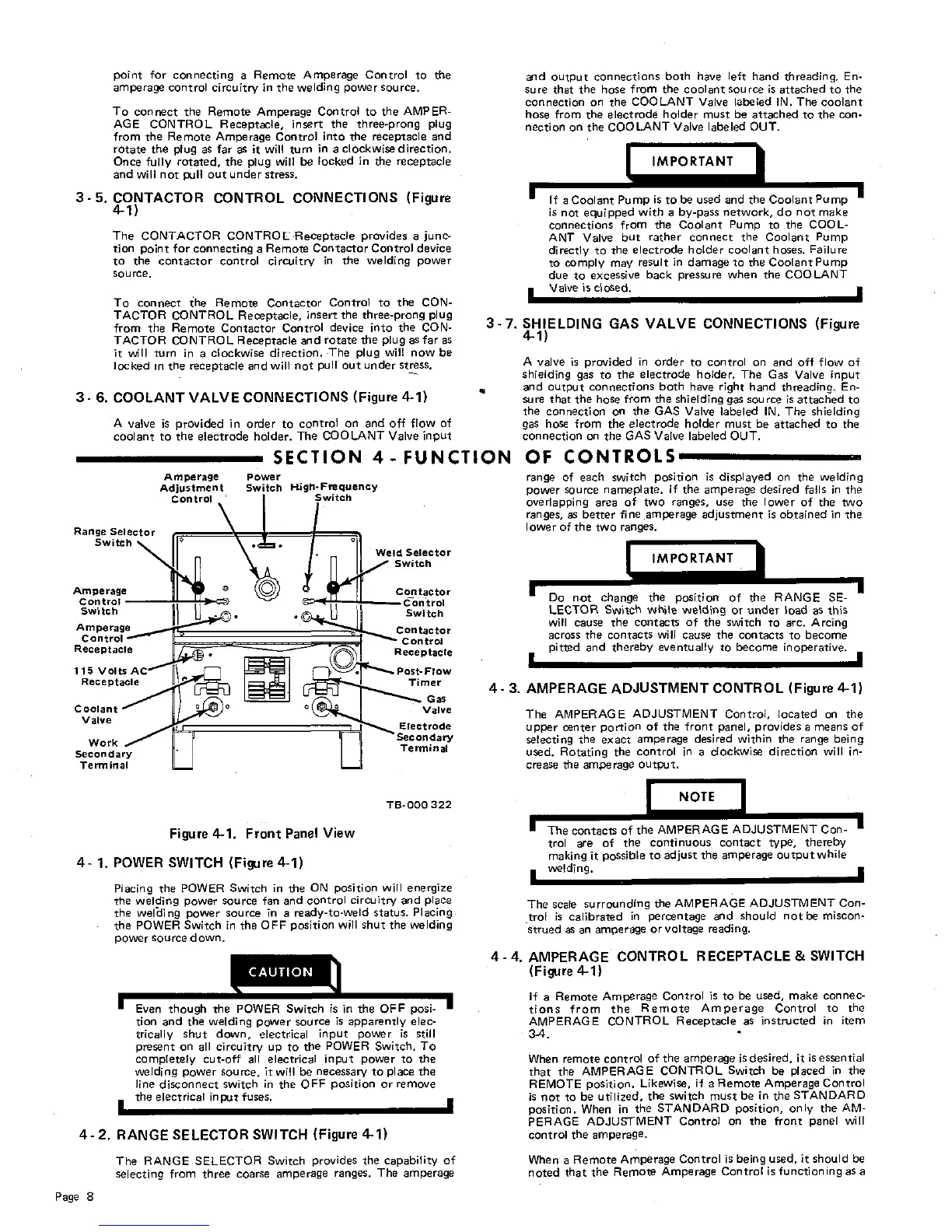 Miller DIALARC HF - Function of Controls; Power Switch Operation; Range Selector Switch Adjustment; Amperage Adjustment Control