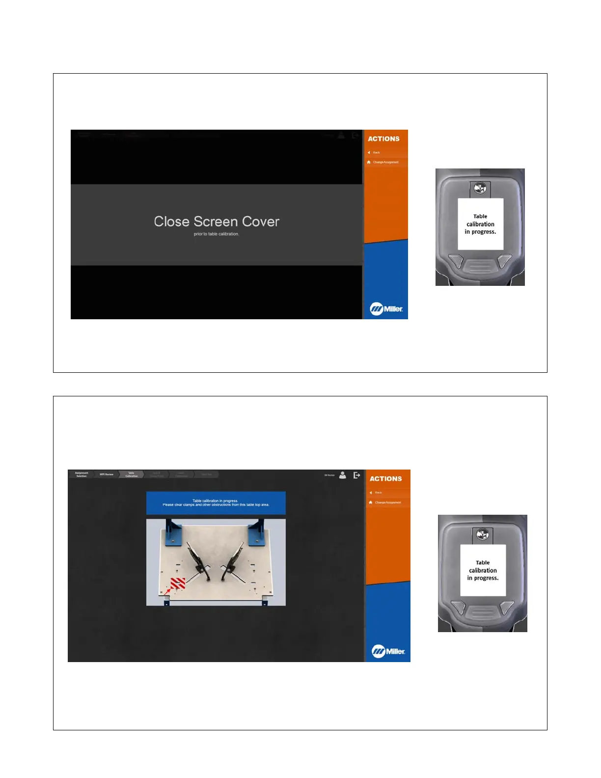 1. Close touchscreen cover to enable table calibration process. Remove any objects blocking markers on table. See Figure 7-7, Figure 7-8, and
