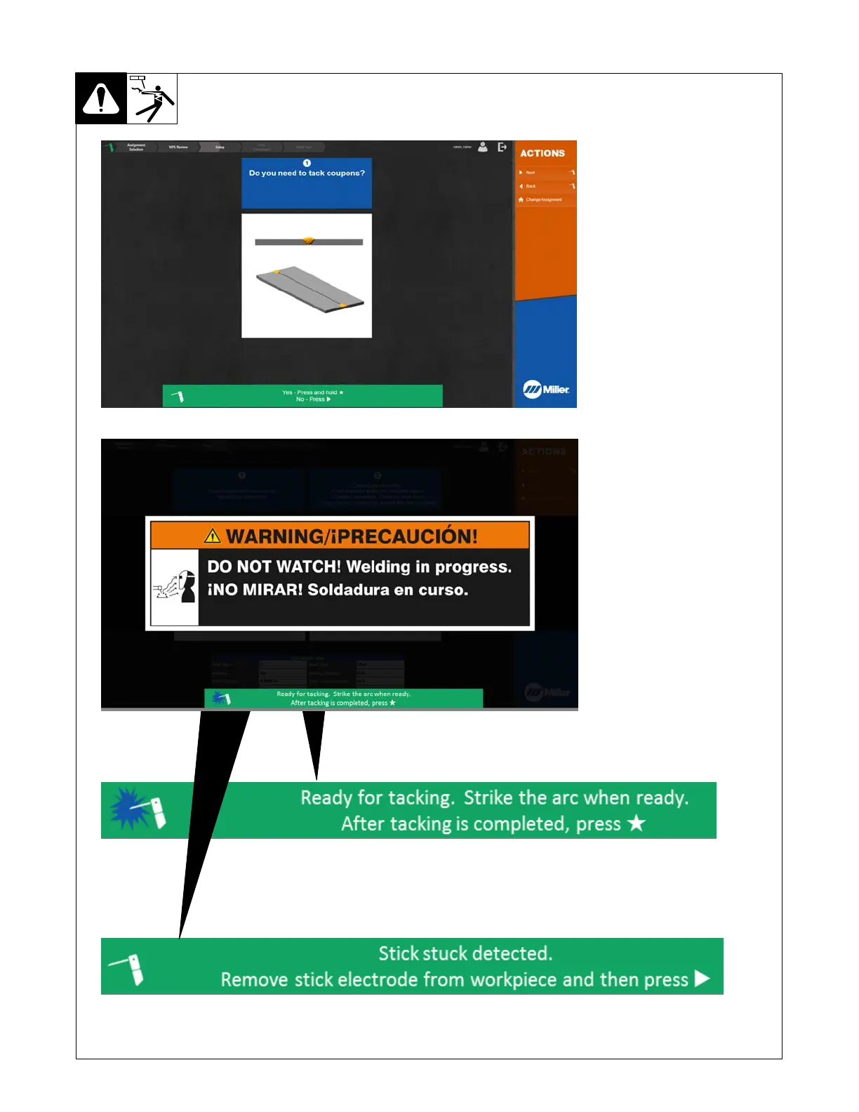 warning message. Tack weld