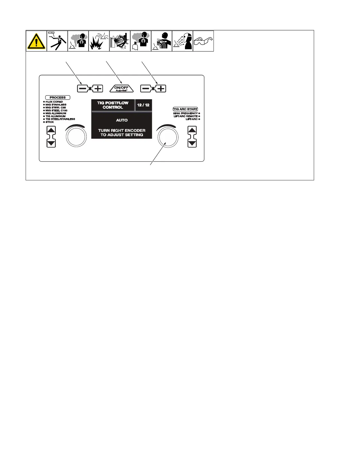 To adjust TIG postflow, turn right encoder.