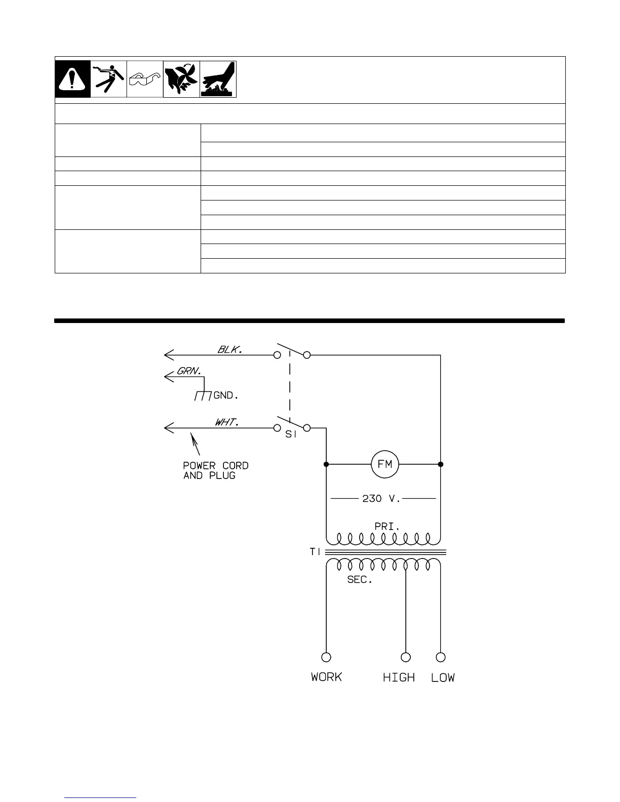 Fan does not run; weld output okay. Be sure nothing is blocking movement of fan. If fan does not run freely, replace fan motor.