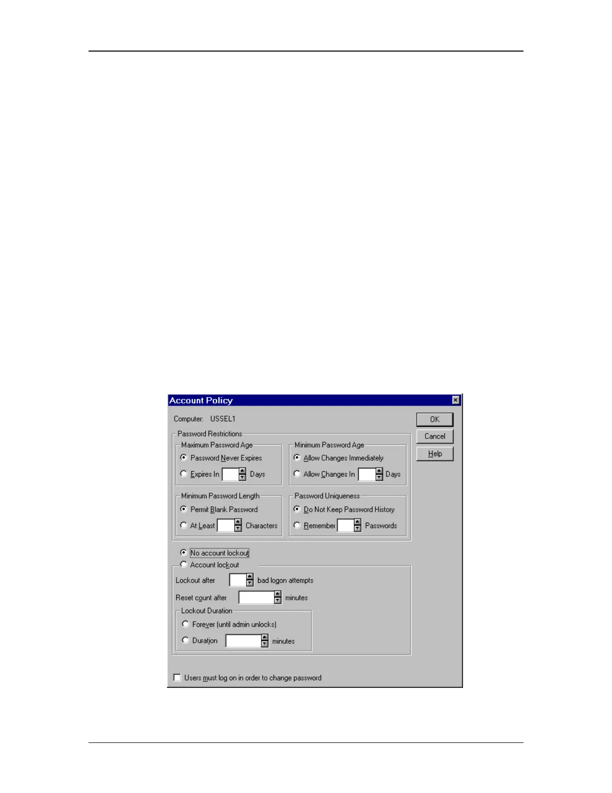 2. The Account Policy window will open (see Figure 30).