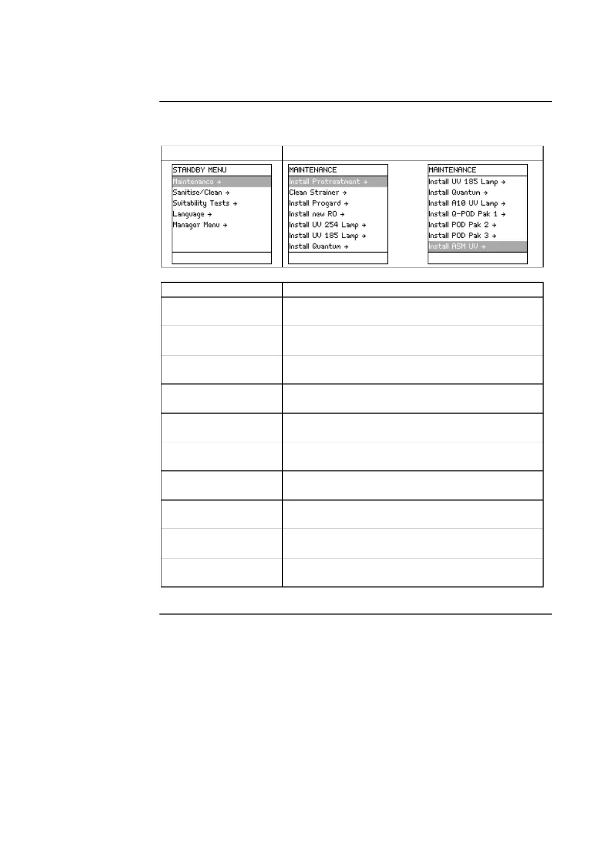 The Maintenance Menu is described below.