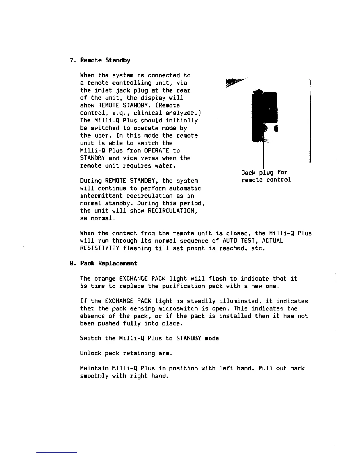 When the contact from the remote unit is closed, the Milli-Q Plus
