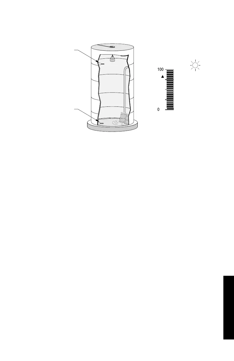 c) high alarm trips on (as preset) at 90% (4.5 m) and off at 85% (4.25 m).