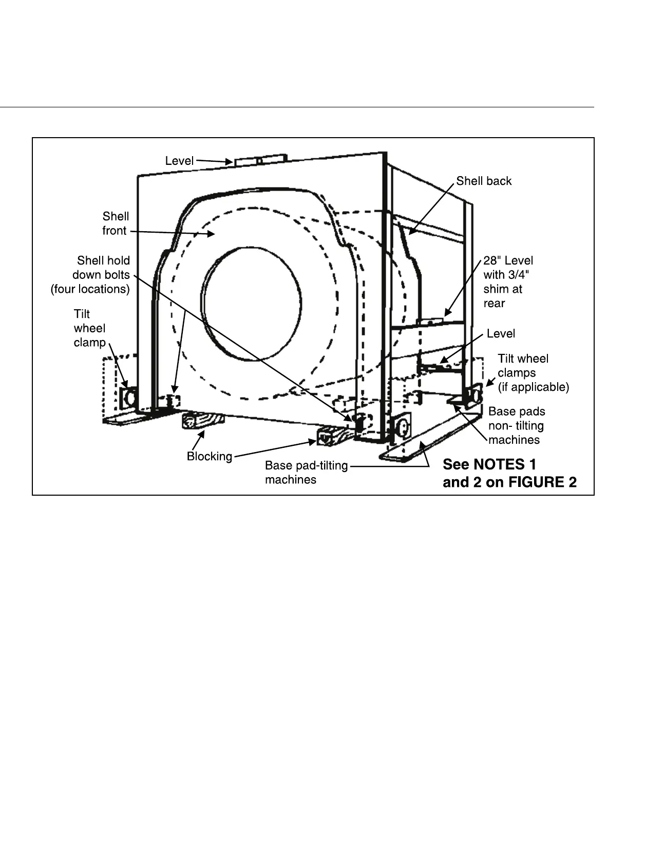 1. Lower the machine onto removable blocking, such that the shell front and shell back are resting on the block-