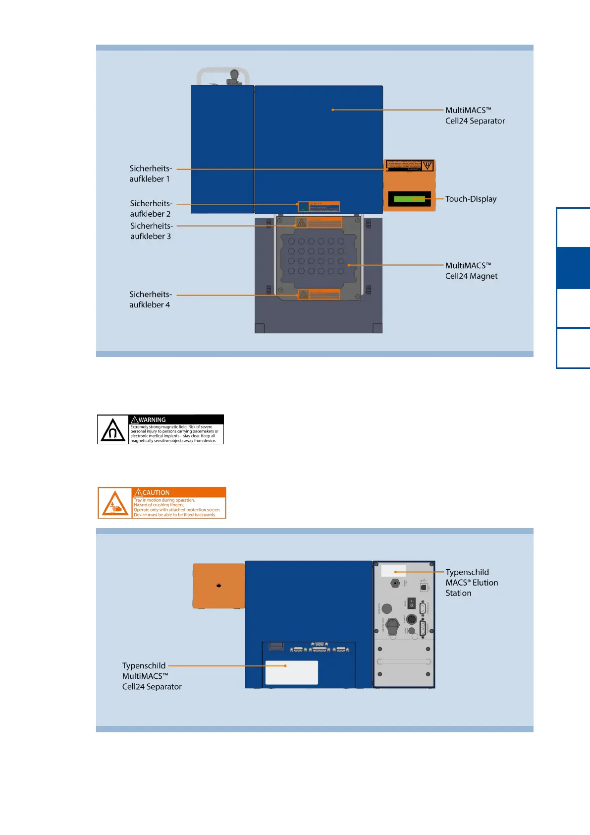 Figure 1: Warnhinweise und Position der Sicherheitssymbole auf dem MultiMACS Cell24Separator Plus.