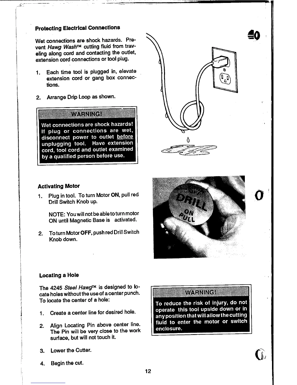 Milwaukee 4245 - Protecting Electrical Connections; Activating Motor; Locating a Hole