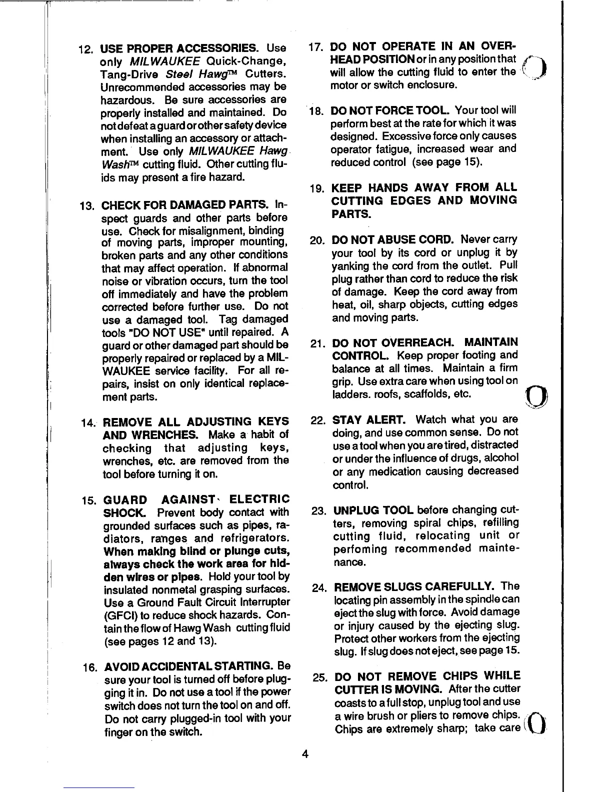 Milwaukee 4245 - Accessory and Part Safety; Operational Hazard Avoidance; Cutting and Chip Safety; Electrical Safety