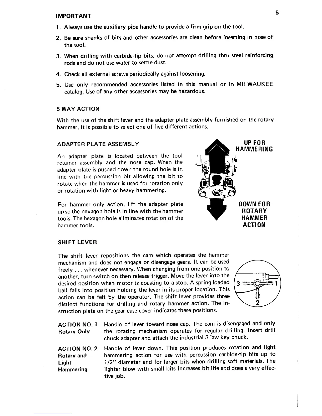 Milwaukee 5300 - Operating Modes and Controls; Important Operating Precautions; Five-Way Action System; Shift Lever and Adapter Plate