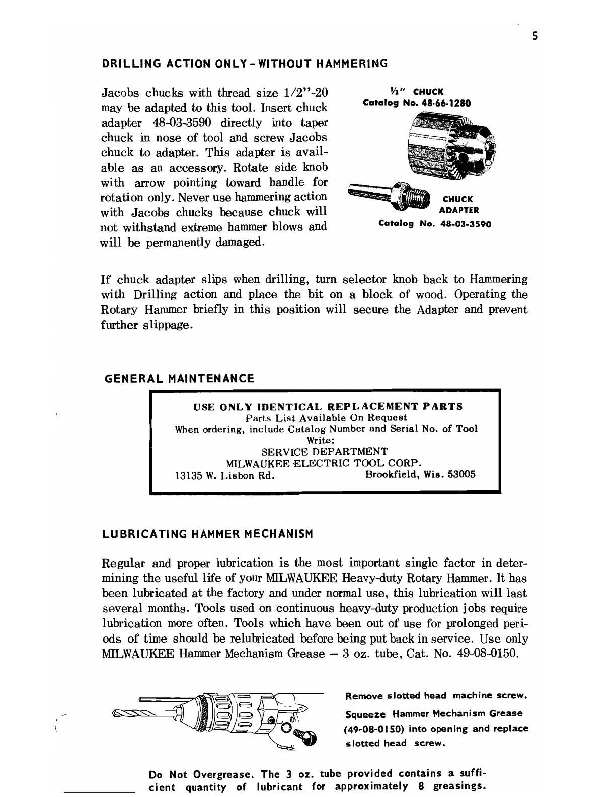Milwaukee 5350 - Drilling Action Mode; General Maintenance; Hammer Mechanism Lubrication