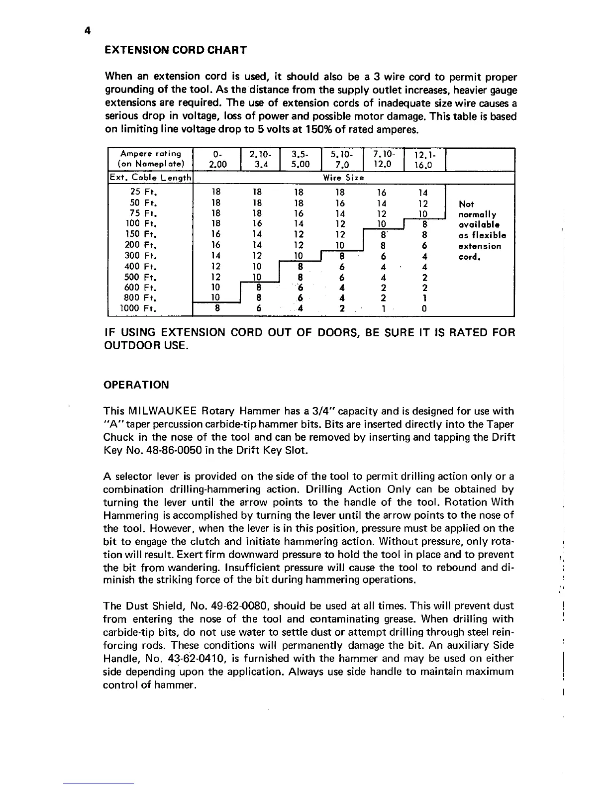 Milwaukee 5351 - Operating the Rotary Hammer; Extension Cord Chart; Tool Operation Modes; Using Accessories and Dust Shield