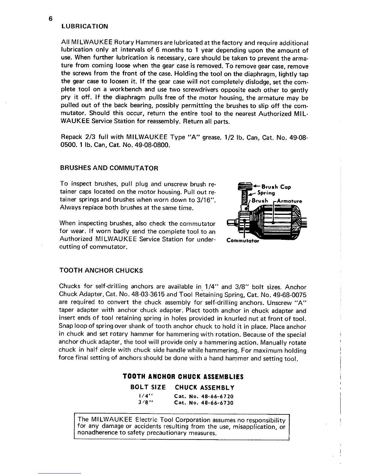 Milwaukee 5351 - Component Maintenance and Accessories; Brush and Commutator Inspection; Tooth Anchor Chucks