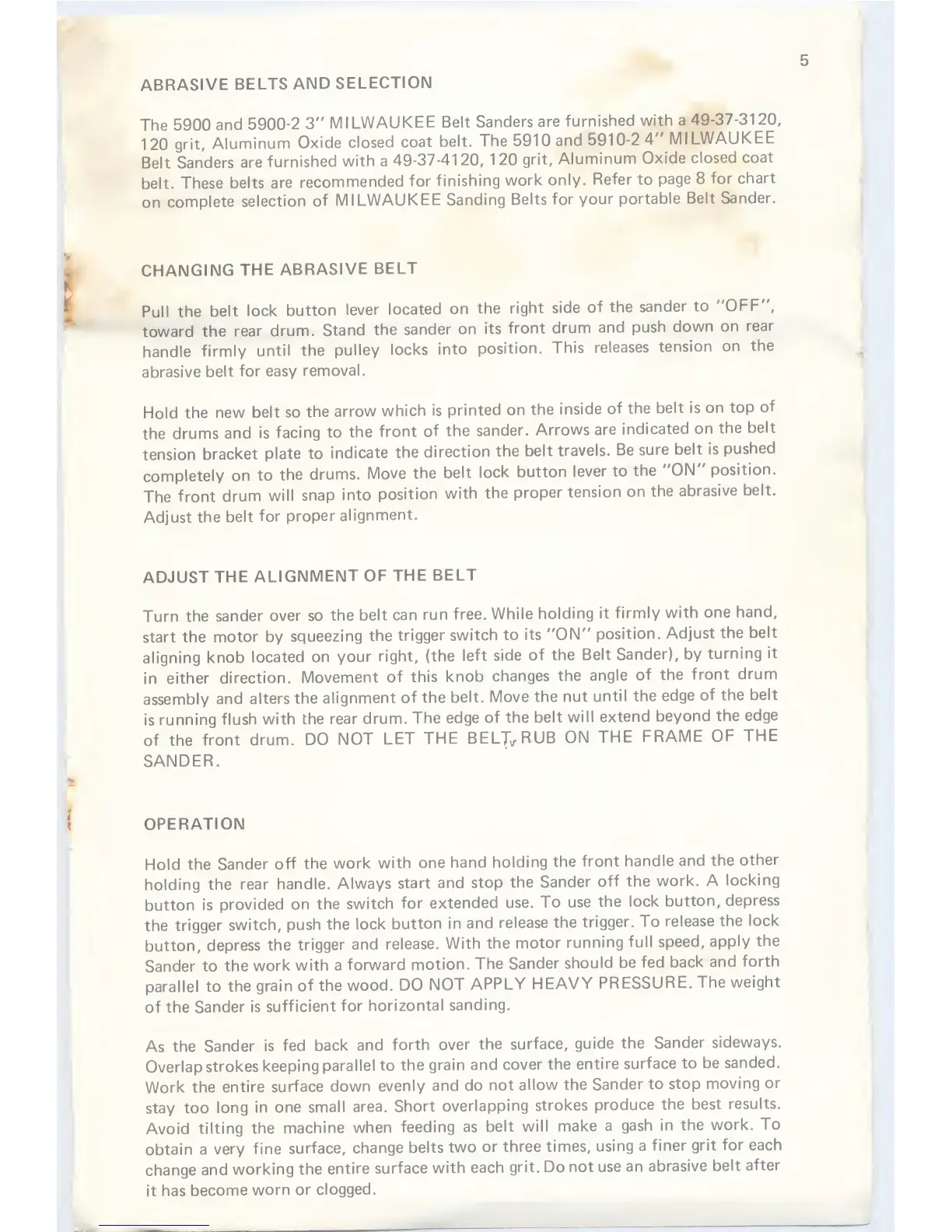 Milwaukee 5900-2 - Abrasive Belts and Selection; Changing the Abrasive Belt; Adjust the Alignment of the Belt; Operation