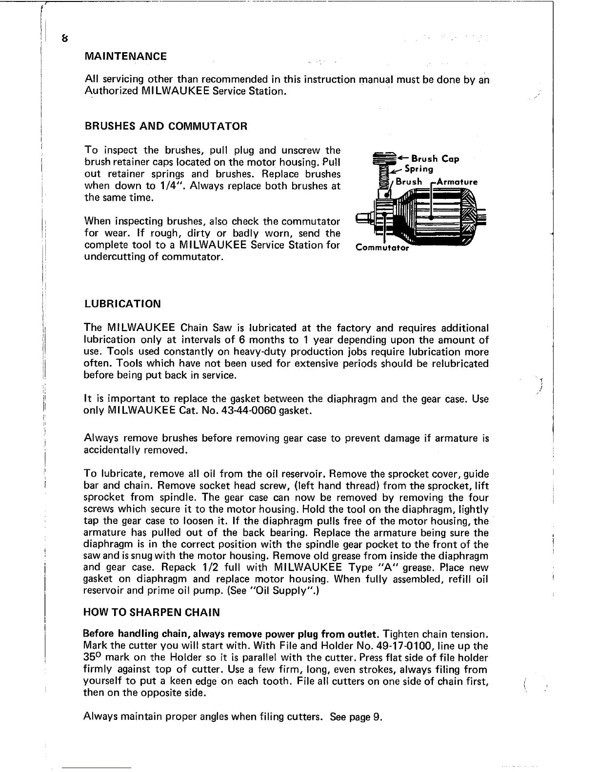 Milwaukee 6210 - Maintenance and Brush Inspection; Chain Sharpening Process