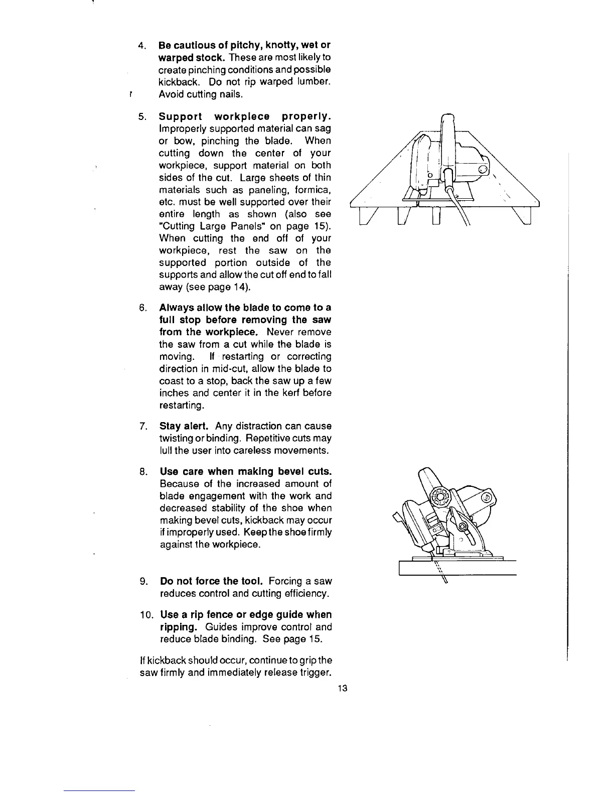 Milwaukee 6365 - Operational Techniques and Cautions; Workpiece Cautions and Support; Blade Stop and Alertness; Bevel Cuts and Tool Force