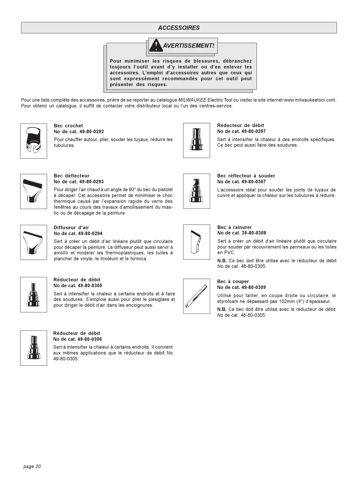 Pour une liste complète des accessoires, prière de se reporter au catalogue MILWAUKEE Electric Tool ou visiter le site internet www.milwaukeetool.com.
