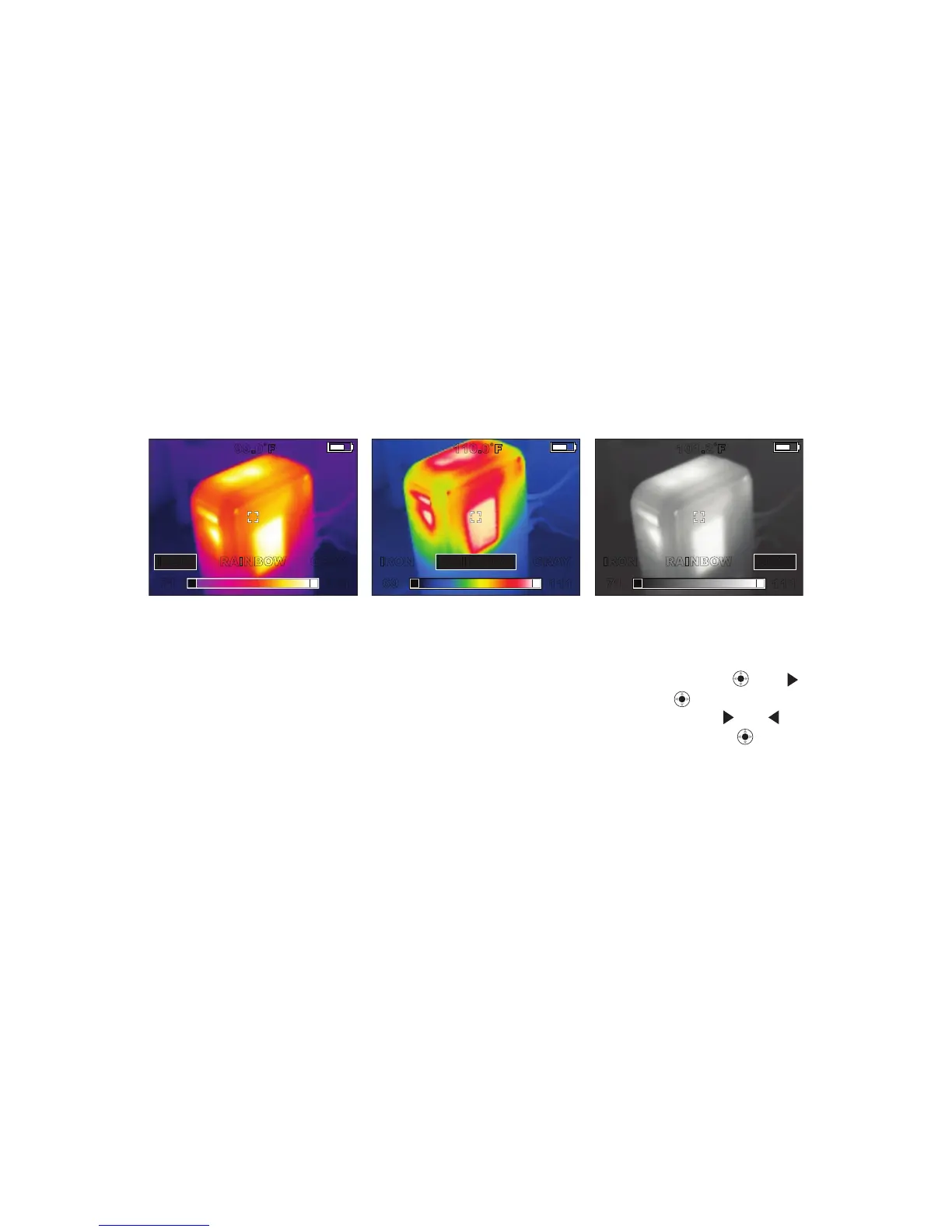 The default color palette is called “IRON.” IRON, RAINBOW and GREY are all shown in Figure 14. IRON is the default. It
