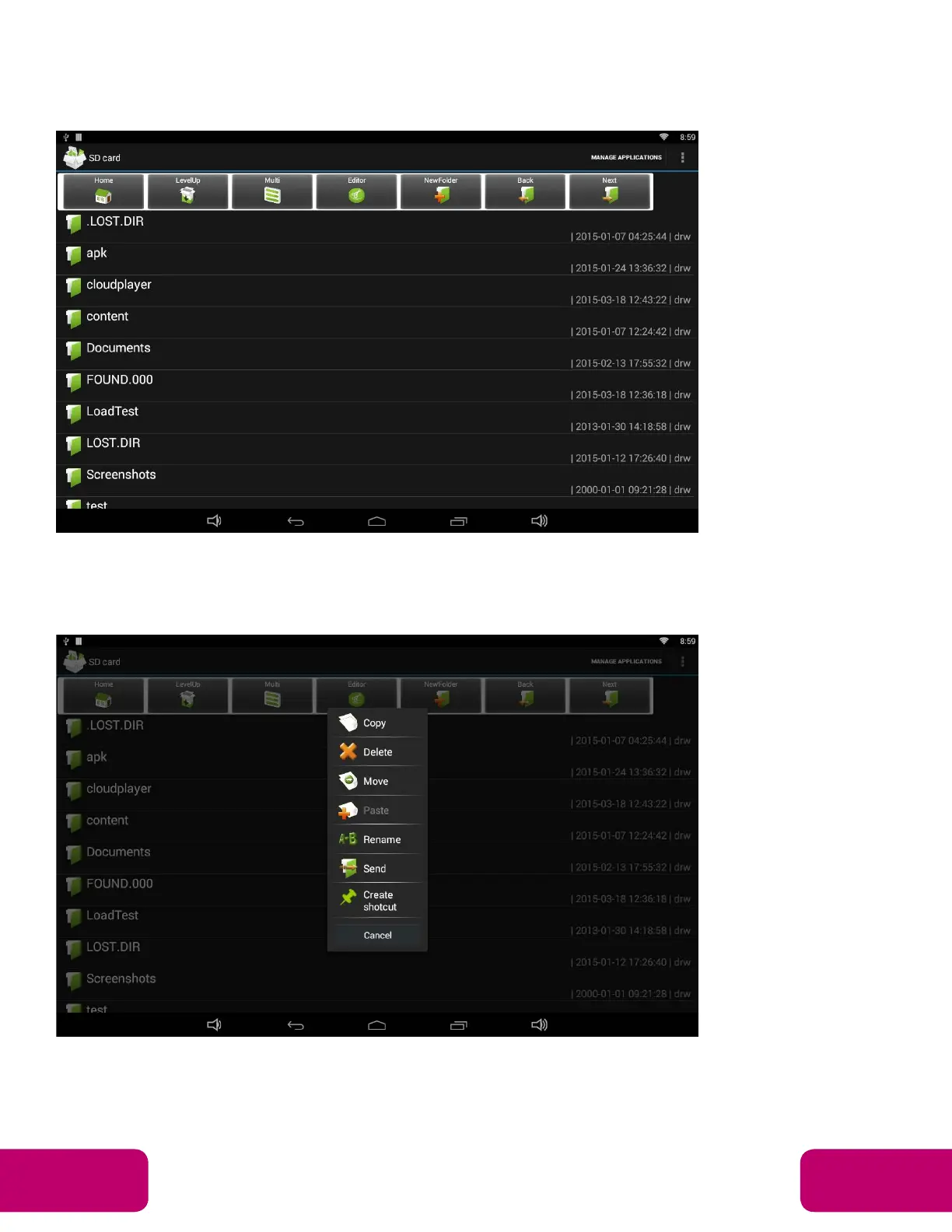 delete, move (cut), paste, rename, send (share) and create shortcut.