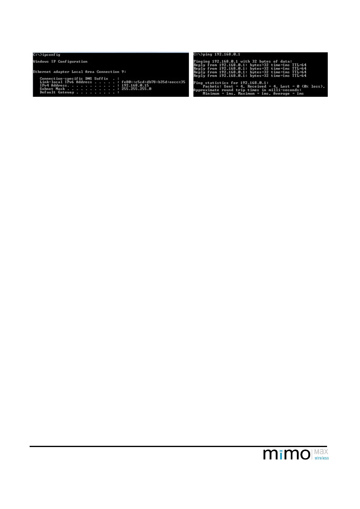Figure 1 Ipconfig on the left (In this case the gateway has not been set properly!) and on the right Pinging 192.168.0.1 (the BRU)