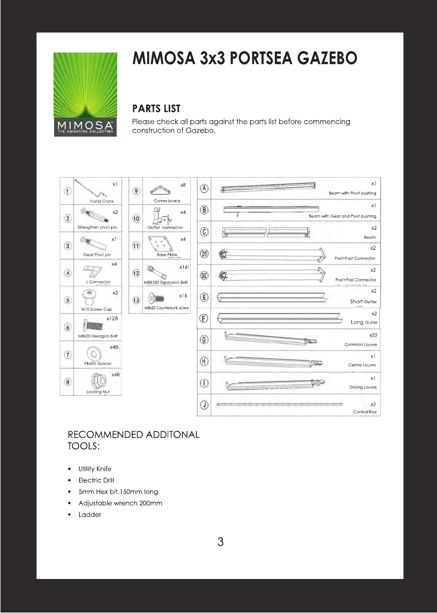 Mimosa 3x3 Portsea Gazebo - Parts and Tools List; Gazebo Components; Recommended Tools for Assembly