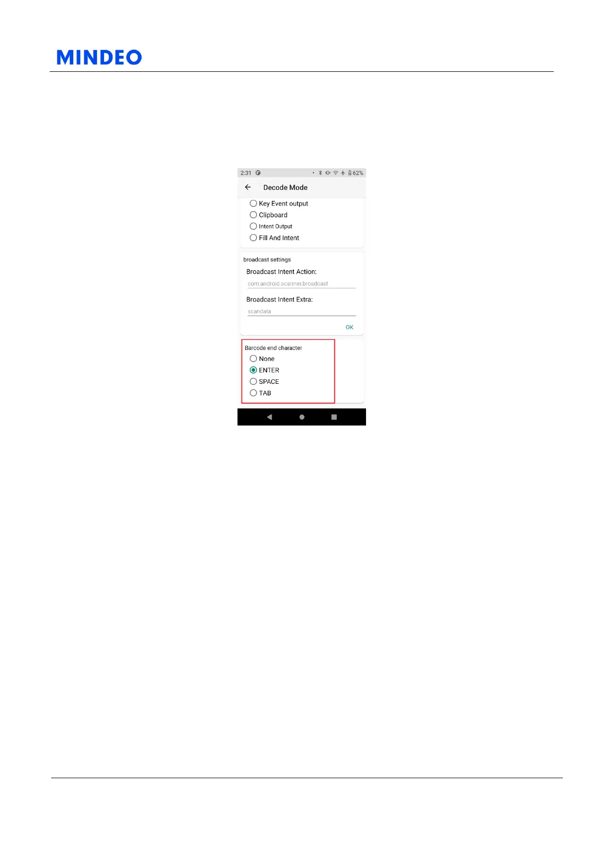 The barcode end character you selected will be appended to the scan result and displayed at the position